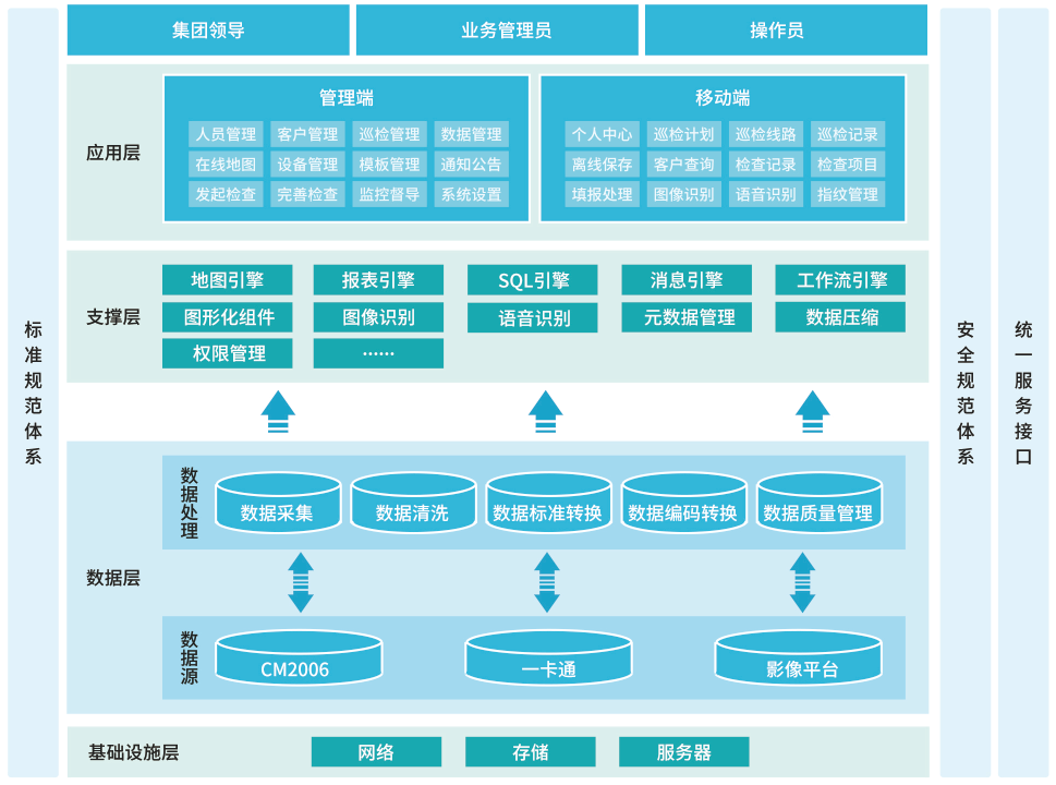 建设标准规范体系和安全规范体系,具体包括数据标准规范、接口标准规范的定义,以及应用安全、数据安全等建设。