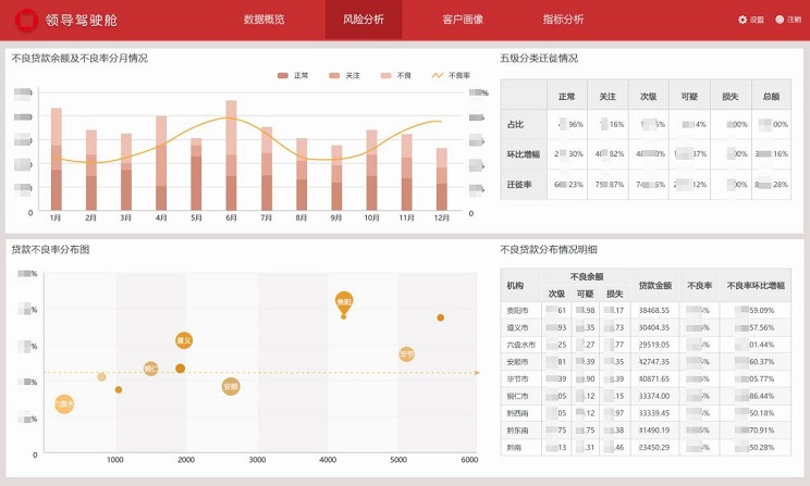 系统覆盖了客户风险月报的常用固定报表、分析报表、综合查询、等业务需求;同时为了满足各级领导快速直观地分析掌握全行客户风险情况的需要,开发实现了领导驾驶舱功能;为了满足业务人员能够灵活便捷地对财政收支数据进一步分析,开发实现了自助分析功能。