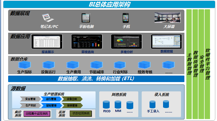 基于数据仓库理念和思想,对公司不同应用系统的数据进行整合,实现新能源公司总部及各分、子公司的核心业务数据集中、集成与优化整合,统一指标口径,建立新能源电力公司的数据中心,从而消除信息孤岛,实现所有业务数据的统一管理。