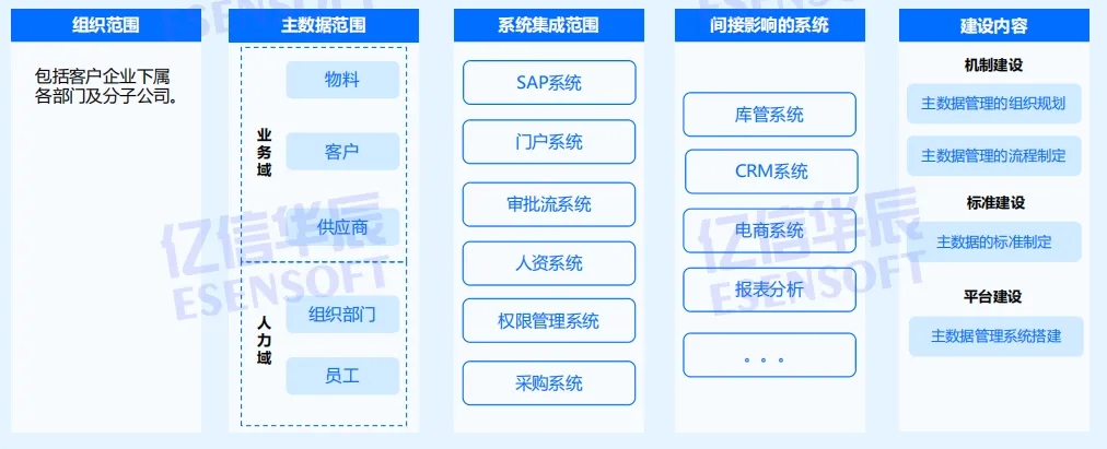 主数据范围则聚焦于两大关键领域——业务域与人力域,前者涵盖物料、客户、供应商等核心主数据,后者则聚焦于组织结构与员工信息。