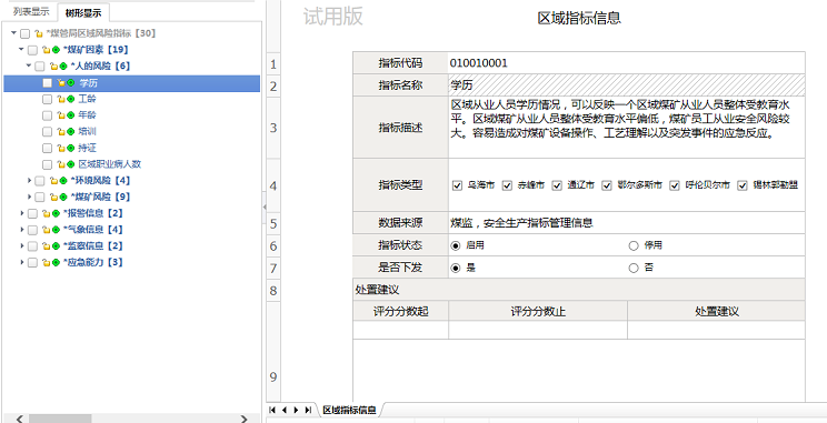 该平台为构建煤矿安全风险指标体系和风险预警分析模型而服务,顺利获得构建符合当地特点的煤矿安全风险指标体系和风险预警模型,利用人工智能和机器学习,不断积累优化模型知识库,对煤矿风险进行迭代和推理,针对不同特点煤矿构建自适应的煤矿风险预警分析模型,动态对煤矿风险进行自动评估。同时,针对该省内不同区域煤矿特点,构建区域指标体系和自适应的区域风险预警分析模型,对不同区域风险进行研判,动态对区域煤矿风险进行评估。