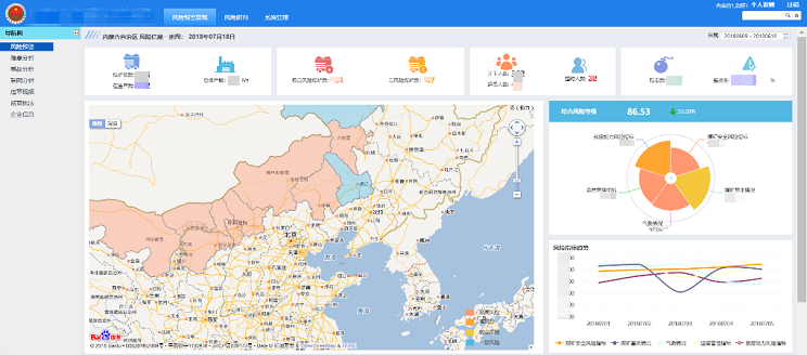 风险预警子系统顺利获得各“一张图”界面,直观展现各指标,分布情况。采用GIS地图热区、热点色块和标点来显示指标状态和分布状态。按照红橙黄蓝进行展示风险等级。