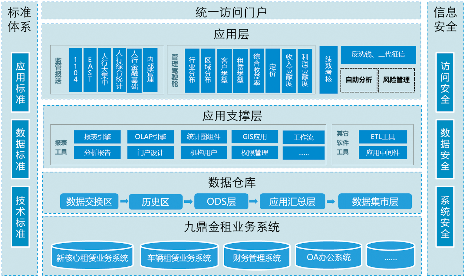 在金融科技数据时代,九鼎金租根据企业业务开展需要,同时满足各监管组织逐步加强的监管要求,亟需搭建企业数据仓库基础平台及相关数据应用系统,实现公司各项监管报表报送、内部管理报表自定义、公司绩效考核、管理驾驶舱、数据支持等功能,充分满足九鼎金租实际业务开展需求,满足人行、银保监等各监管组织的监管数据报送要求,适应金融信息化开展趋势,满足内部管理决策和保持信息化建设先进性对数据处理分析、数据应用的需要,为反洗钱系统、企业征信系统给予数据支持和推送等。在此基础上,完善并建立统一的数据标准和规范,建设统一报表平台,绩效考核应用系统,搭建管理驾驶舱,充分利用数据资源,发挥数据作用,提升决策支持力度,进一步增强企业信息化能力,提升企业核心竞争力。