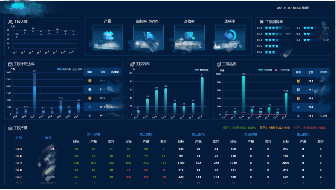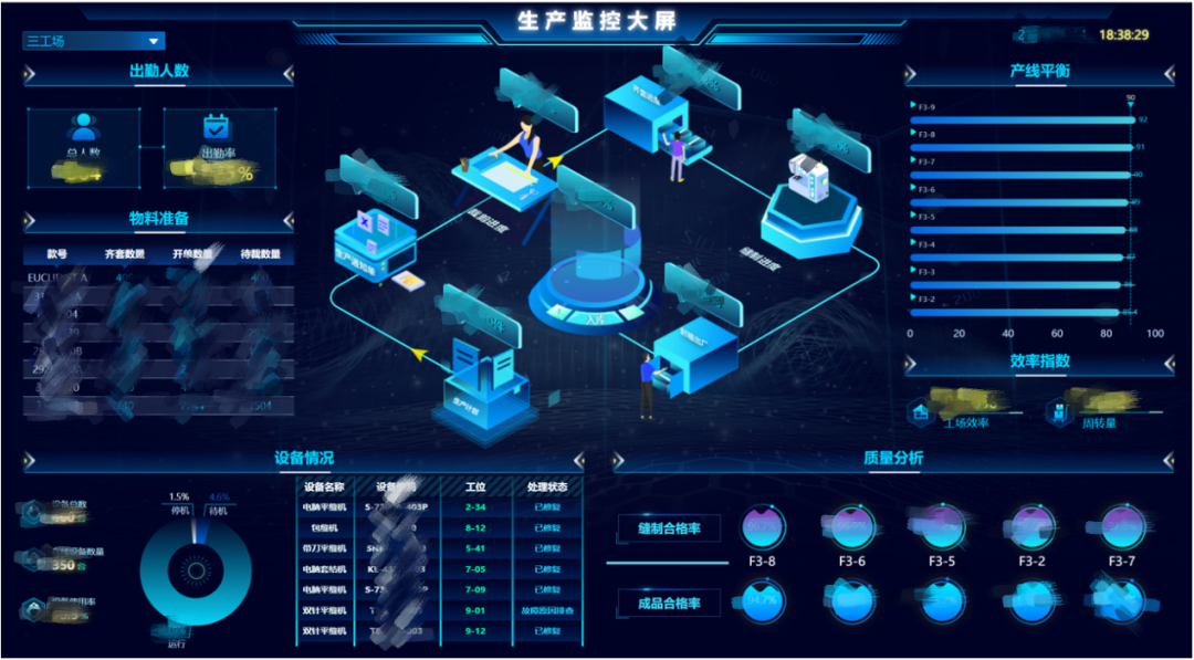 该项目为生产部给予全流程监管报表,并配合移动端、电视、大屏多种展现形式,在车间、园区、监控中心多个地点同时进行监控:(注:以下所有数据均已脱敏)