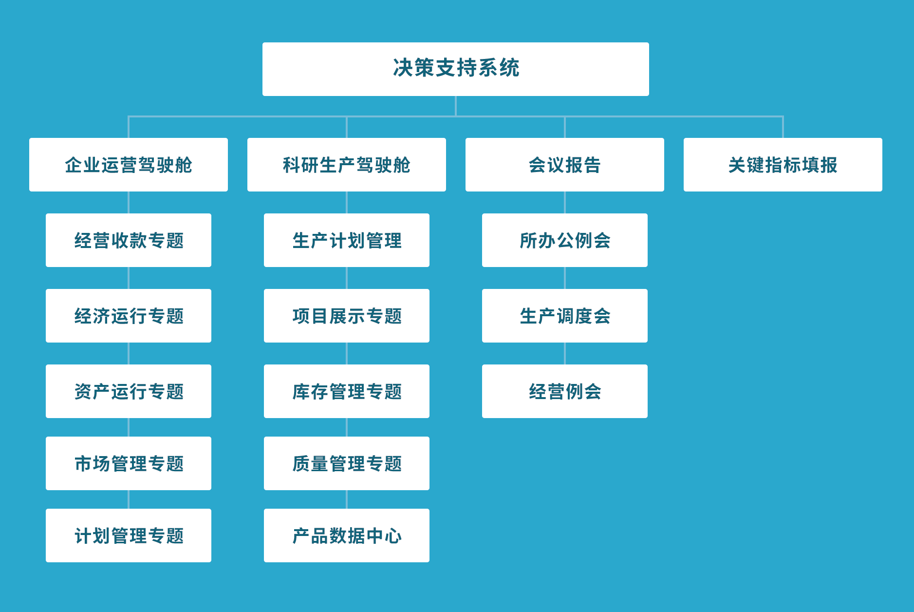 依据数仓中的数据建设完成了企业运营驾驶舱、科研生产驾驶舱及各专题页面的开发,整个决策支持系统功能架构如下:
