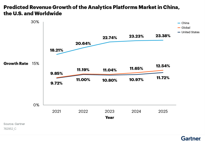 商业智能解决方案的有助于下,到2023年,整体分析采用率将从35%增加到50%。预计到2025年,中国分析平台市场规模将达到16亿美元,市场增长率将由18.21%提升到23.38%,是全球(12.54%)和美国(11.72%)市场预期增长的两倍左右。