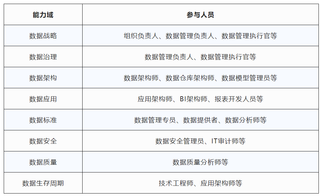 从企业评估过程中来看,一般来说,数据战略和治理需要的是管理人员,其余6个能力域需要的是技术人员,从实际评估角度来说,企业匹配人员一般在3-8个,在申请比较低的等级过程中,一个人可以覆盖2~3个能力域。