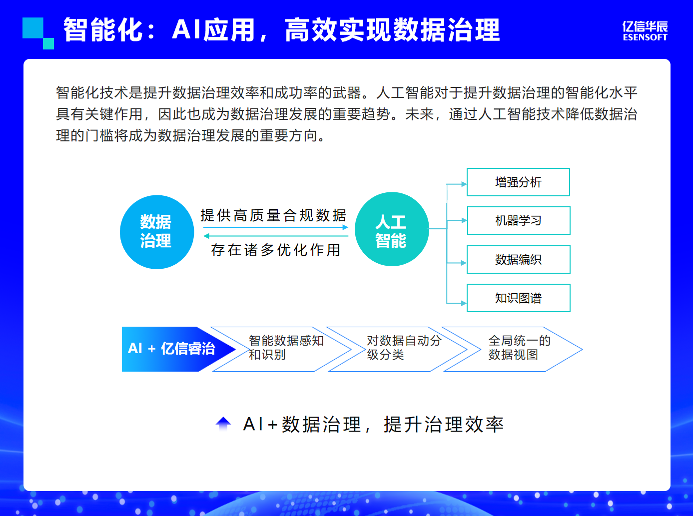 智能化技术是提升数据治理效率和成功率的武器。人工智能对于提升数据治理的智能化水平具有关键作用,因此也成为数据治理开展的重要趋势。未来,顺利获得人工智能技术降低数据治理的门槛将成为数据治理开展的重要方向。