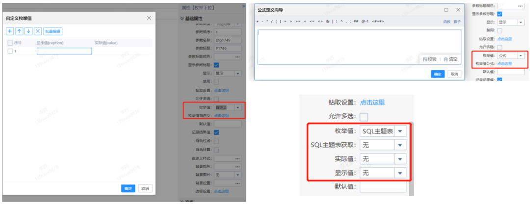 用户使用枚举下拉框组件时,给予可视化界面方便批量编辑枚举值、编辑枚举值公式;用户报表使用枚举下拉组件时,枚举值中的内容若需要传参,可从SQL主题表取数.