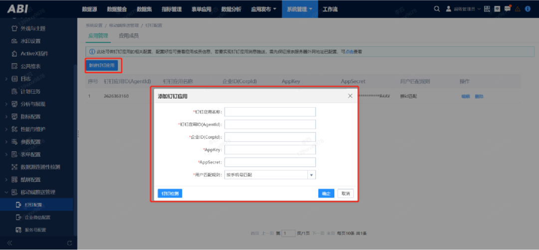 当用户需要将报表在钉钉中展现时,平台给予钉钉集成的相关配置;用户将消息推送到钉钉应用时,同时可查看钉钉应用的成员信息。