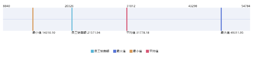 类似标尺一样的,能够按照其刻度的位置显示出某些值的位置及数值。它是在水平视线上,直观地看出各数值间差距的一种图表类型。如下全距图,展示了员工的销售额在所有销售员销量水平中的位置。