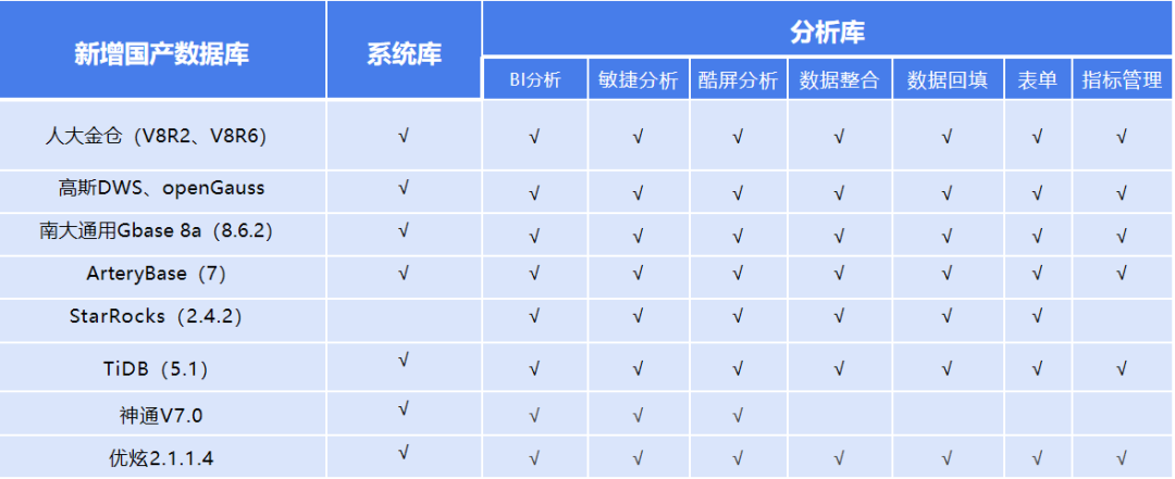 此次亿信ABI5.4.3版本实现更全的国产化数据库兼容性,新增对人大金仓、高斯DWS、openGauss,南大通用Gbase 8a,ArteryBase,StarRocks,TiDB,神通,优炫等9种国产数据库的深度兼容。
