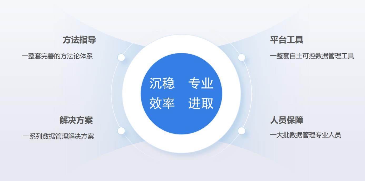 一整套完善的方法论体系:基于DCMM和DAMA数据管理体系,沉淀出成熟、完善且实用的数据管理方法论框架,从指导企业明确自身在数据管理方面的战略目标,到现状分析评估,再基于现状做体系规划,用工具实现规划中的各平台建设,保证实施落地,最后为企业培训,实现知识转移。