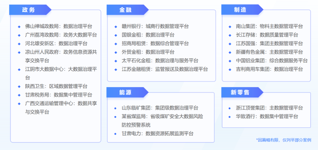 在政府行业,以佛山市某区政务服务数据管理局为例,利用睿治数据治理平台建设的数据治理项目,实现了全区的政务数据融合,为部门及数据应用给予高质量数据支撑,搭建数据治理框架,凸显数据治理成效。此项目不仅得到客户及行业认可,并且该区政务服务数据管理局还荣获第三届数据标准化及治理优秀实践单位。