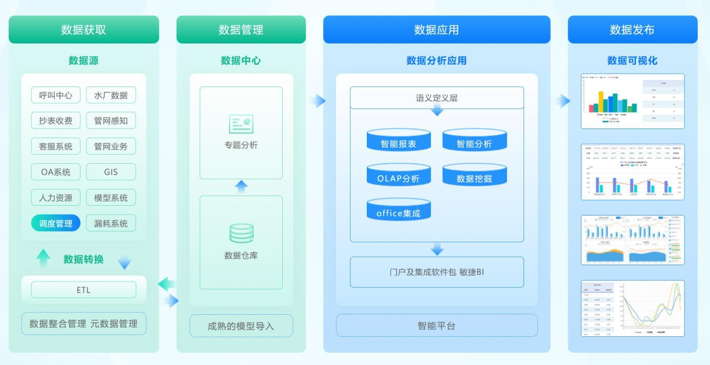 平台可顺利获得营销分析、生产分析、管网分析、客服热线分析、水质分析等模块化主题分析,来辅助水务企业定位问题、成本控制、提高运营效率与服务质量,保障安全供水。针对不同业务情况,平台可根据业务分类实行精细化分类管理,进行精准化专题分析。平台给予领导驾驶舱、自助式即席分析、智能分析报告、报表中心、大屏可视化等多元分析形式与工具,全方位提升数据分析能力,精准支撑决策。平台还给予绩效考核管理功能,顺利获得统一的界面用户可以直观、实时的分析各职能部门或个人工作情况,各职能部门或个人可以根据得分排名情况及时对工作安排与进度作出相应调整。此外,按照现代化水务企业管理标准,以及国际水协指标,水务大数据运营分析平台建立了一套基于供水服务实际需求,与时俱进并符合现代化供水企业管理标准的指标体系。