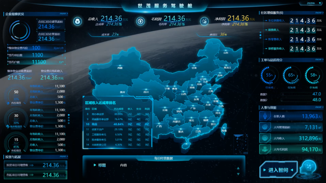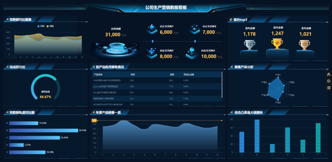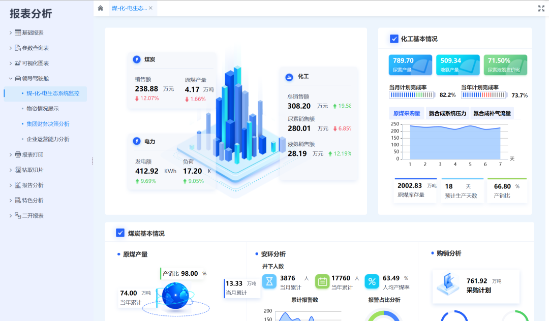 c. 领导驾驶舱更美观丰富,将一些关键的KPI指标简单明了的用图形或仪表盘等形式呈现给决策者,并给予一些易用的交互功能,如钻取和参数切换等。