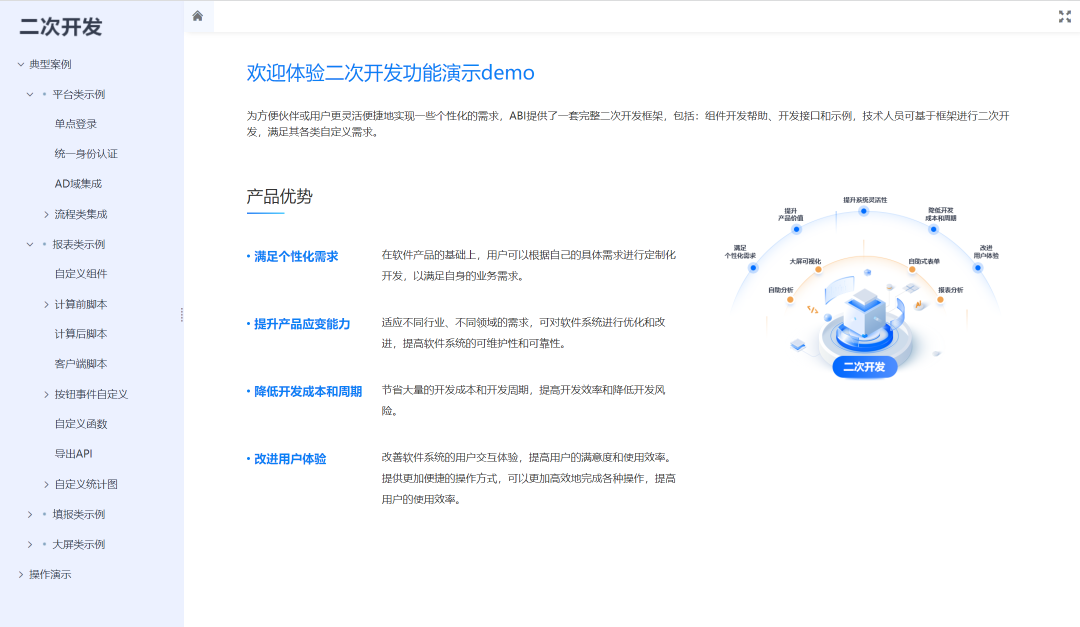 新增二次开发功能模块,内置多样的二开文档及示例,技术人员可基于框架进行二次开发,满足其各类自定义需求。