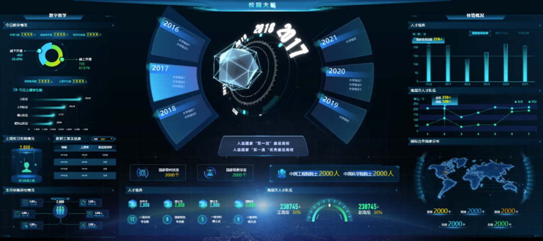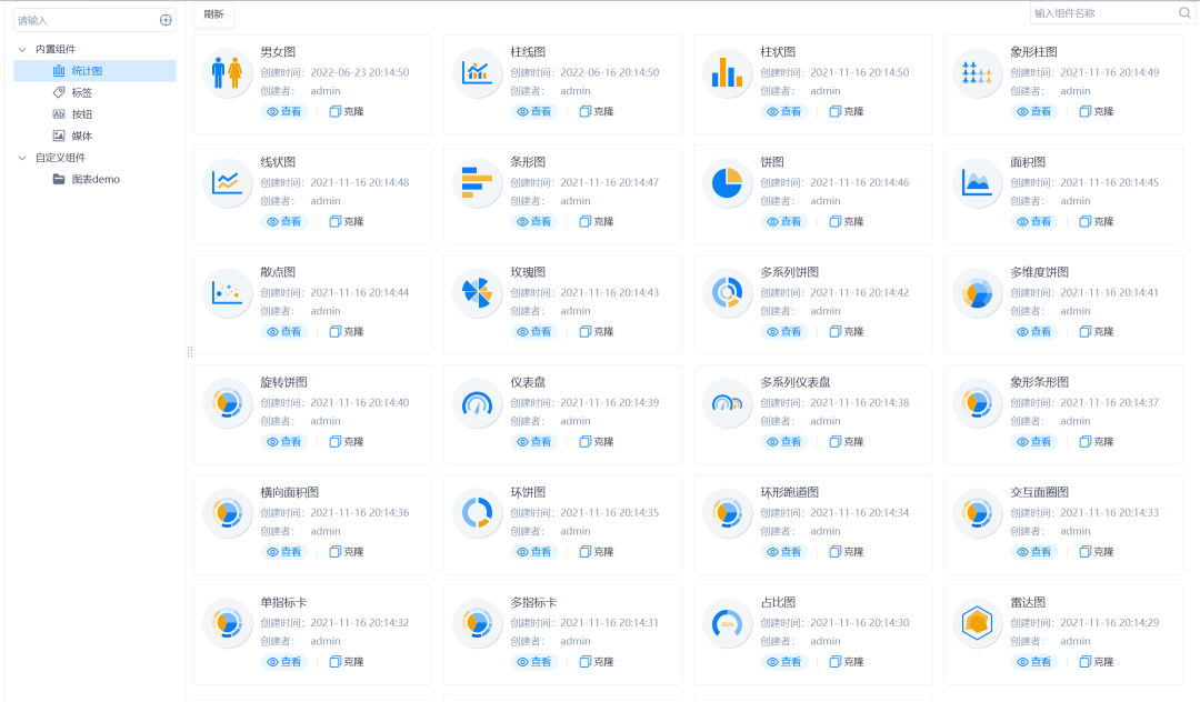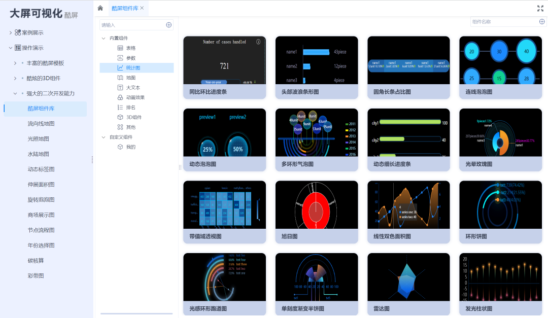 b. 新增23种酷屏模板,十几种3D组件,150+内置基础大屏组件展示,只用拖拽大屏组件就能快速构建一张可视化大屏。