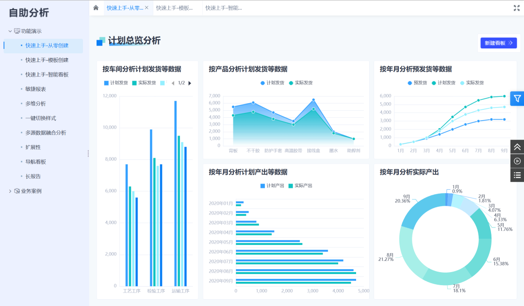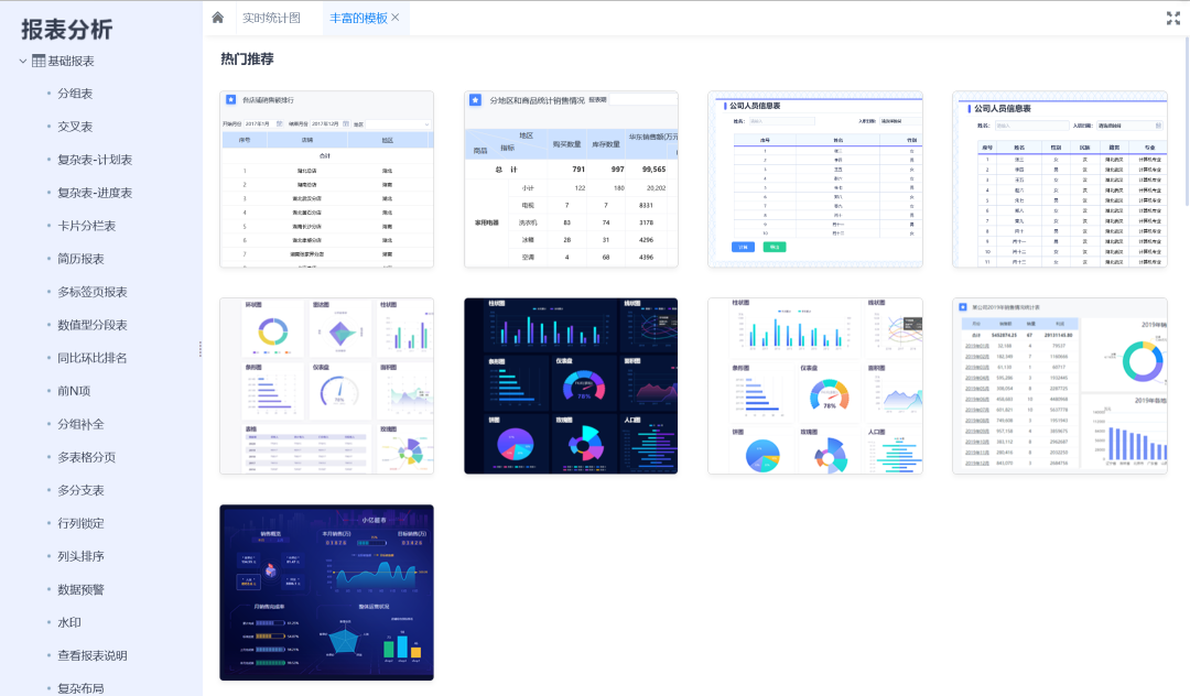 a. 基础报表新增卡片分栏表、多标签页报表等多种报表样式;新增同环比排名、多表格分页、数据预警等多种报表制作的特色功能;并且展示了内置的丰富的报表模板。