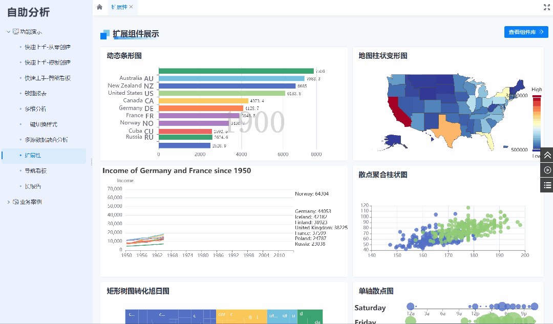 b. 内置丰富的扩展组件,包括动态条形图、地图柱状变形图、单轴散点图、桑基图等,可实现更加丰富酷炫的可视化效果。