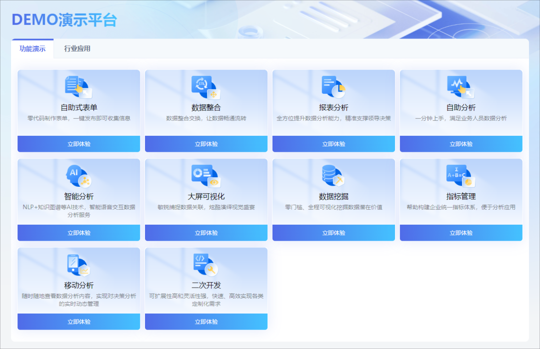 本次更新了数据整合、报表分析、自助分析、大屏可视化的DEMO功能演示,新增了二次开发模块,对数据分析各模块功能进行了全面升级,满足更多需求场景。