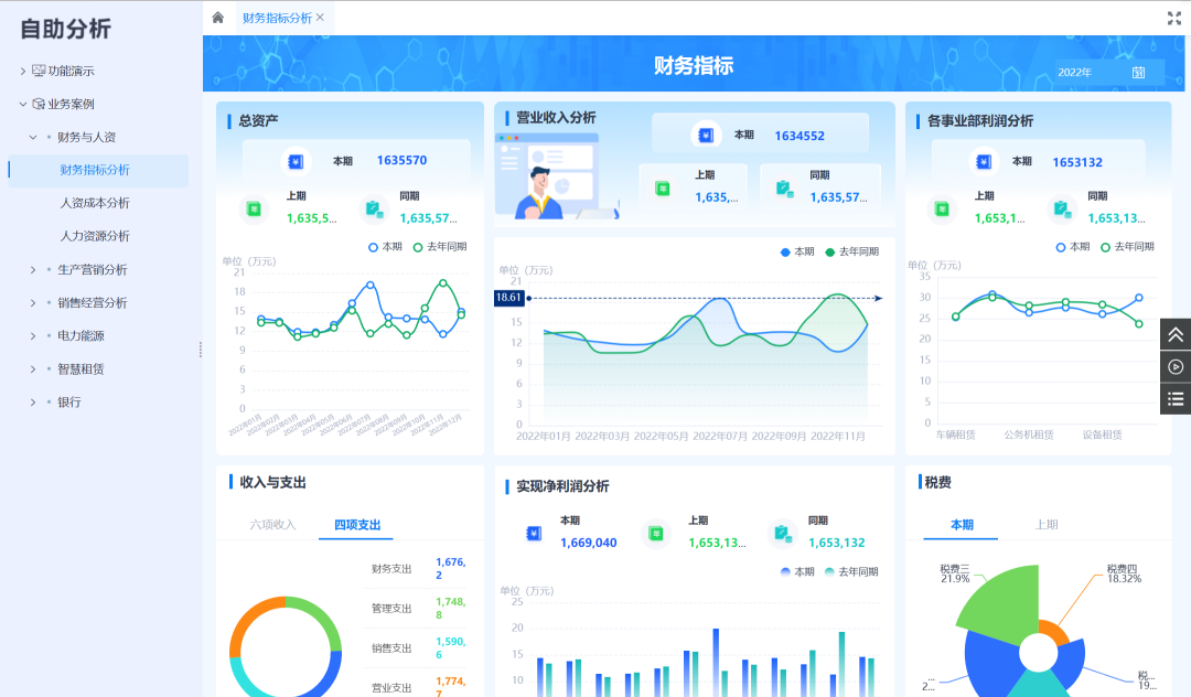 亿信ABI作为一站式数据分析平台,打通了从数据接入、到数据建模与处理、再到数据分析与挖掘整个数据应用全链路,融合了数据填报、数据处理、报表分析、图表分析、炫酷可视化、报告分析、自助分析、智能分析等核心功能。每个功能,在功能演示demo都内置了丰富的实例展示。