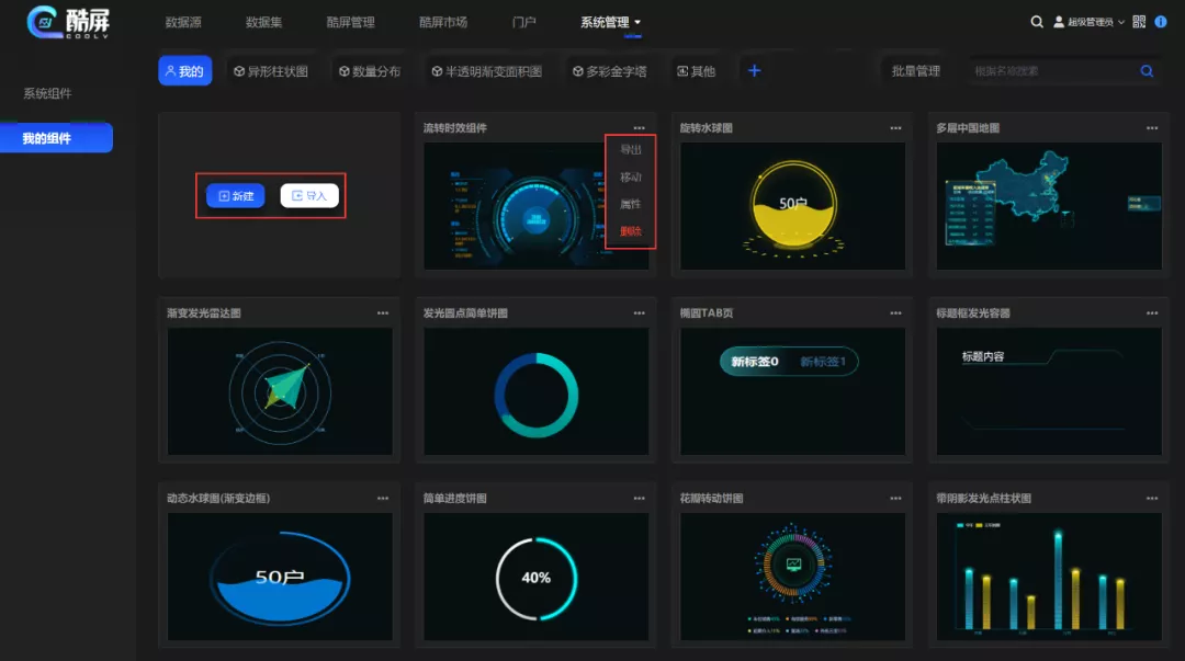 可以在我的组件对自定义组件进行新建、导入导出等。