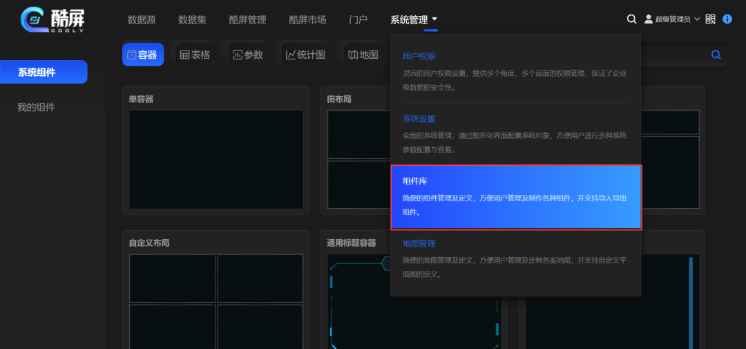 【操作说明】点击系统管理下的组件库,进入组件库管理。