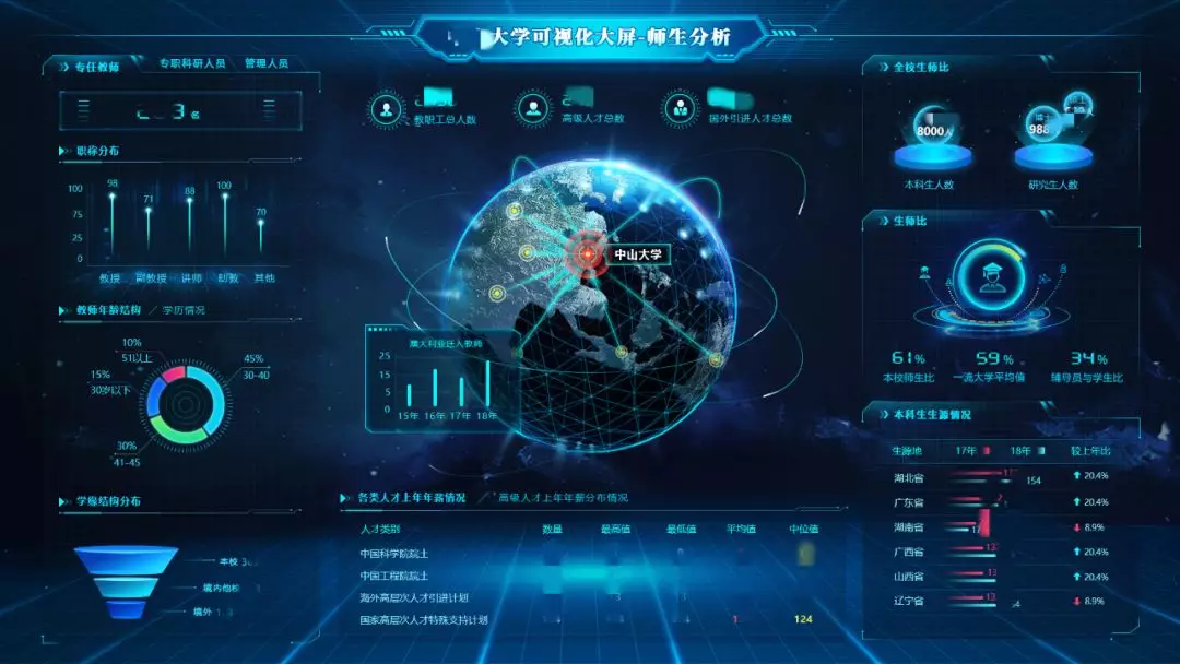 基于亿信ABI软件,中山大学打造可视化大屏项目,可以全局掌握整个学校的学校概况、师资队伍、教学资源、科学研究、学生开展、就业情况和日常运营情况。顺利获得师生分析,来展现学校的整体的实力,对校内师资力量进行全局展示。顺利获得院系分析,实时掌控院系整体建设情况。顺利获得专业建设分析,掌控全校一流专业设点,双一流专业的获奖情况,体现校内校外优势专业的整体实力。