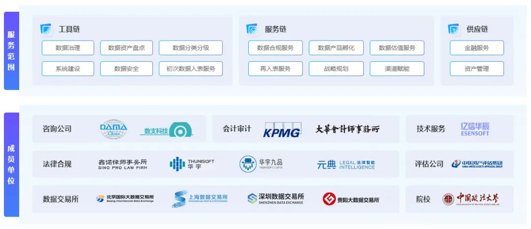 Ebpay与数偕行,联合20+专业组织创建“数据资产入表服务链合体”,拉通会计服务给予方、数据合规评估方、数据资产评估方、数据技术服务方等资源,构建全流程闭环式服务体系,为客户给予一站式数据资产入表解决方案,给予咨询规划、数据资产管理、会计审计、价值评估、法律咨询、安全监管服务,保障数据资产入表规范可信,促进数据要素经济高质量开展。