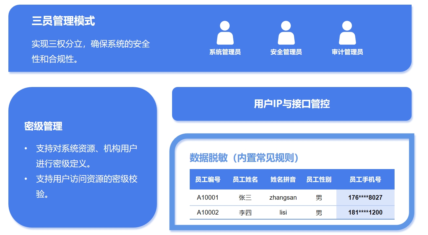 睿码主数据管理平台实现“系统管理员-安全保密管理员-审计员”的三权分立体系,彻底改变传统系统“超级管理员”权限过大的风险,给予更加合理可靠的权限管理制度。