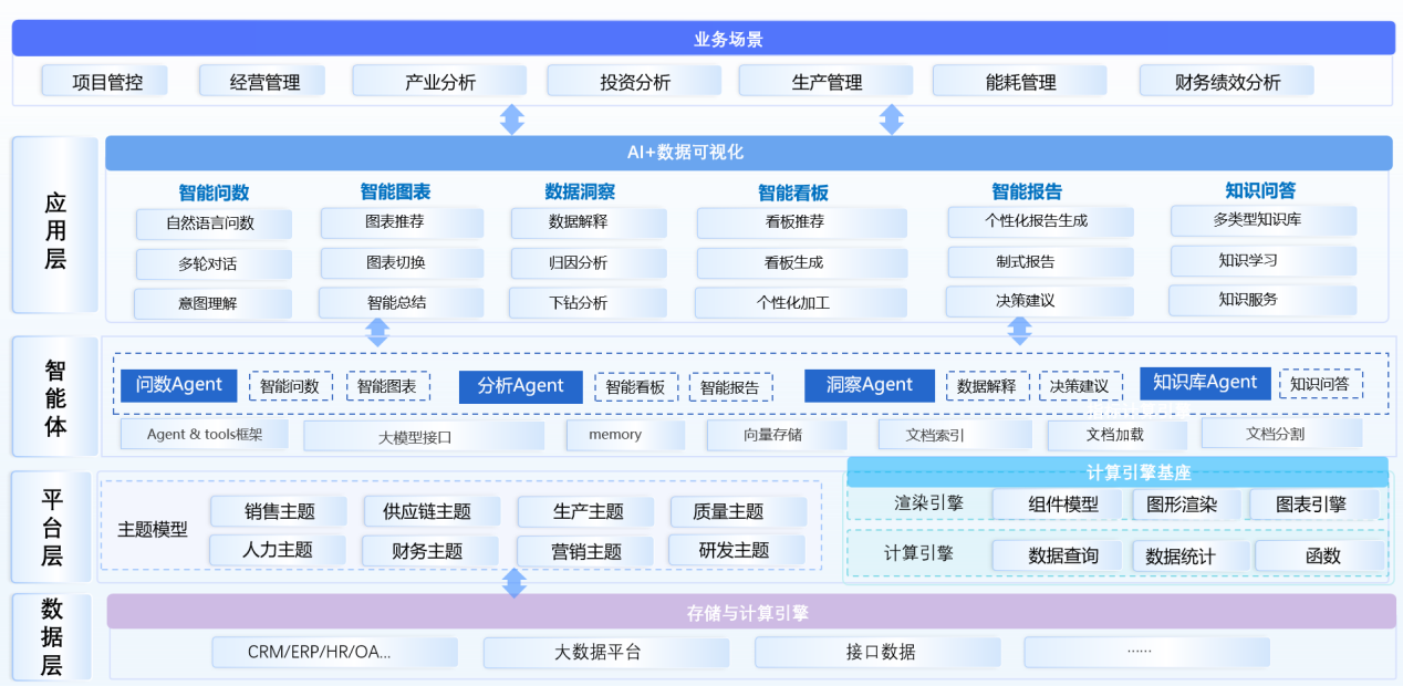 这一变革的底层支撑,是大模型与多Agent技术的深度融合。Ebpay智问BI@GPT正是基于这一逻辑构建数字助理,其架构覆盖数据层(对接CRM/ERP 等多源系统)、平台层(计算引擎 + 渲染引擎)、智能体层(问数Agent、分析Agent、洞察Agent、知识库Agent)及应用层(智能问数、智能图表、智能看板、智能报告等),形成从数据接入到决策输出的全链路闭环。