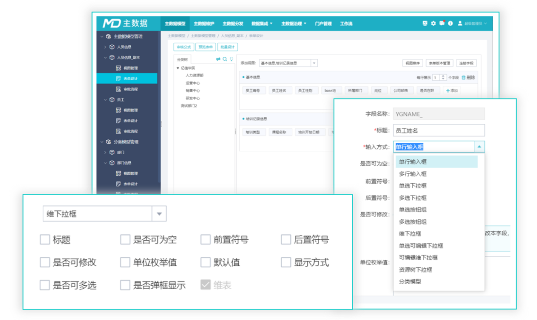 睿治主数据管理模块还给予快速专业的表单设计,支持快速批量创建表单、支持上级表单继承、支持表单版本的记录管理、支持多种输入方式、支持丰富的属性设置,保障数据填报源头的准确性和一致性。