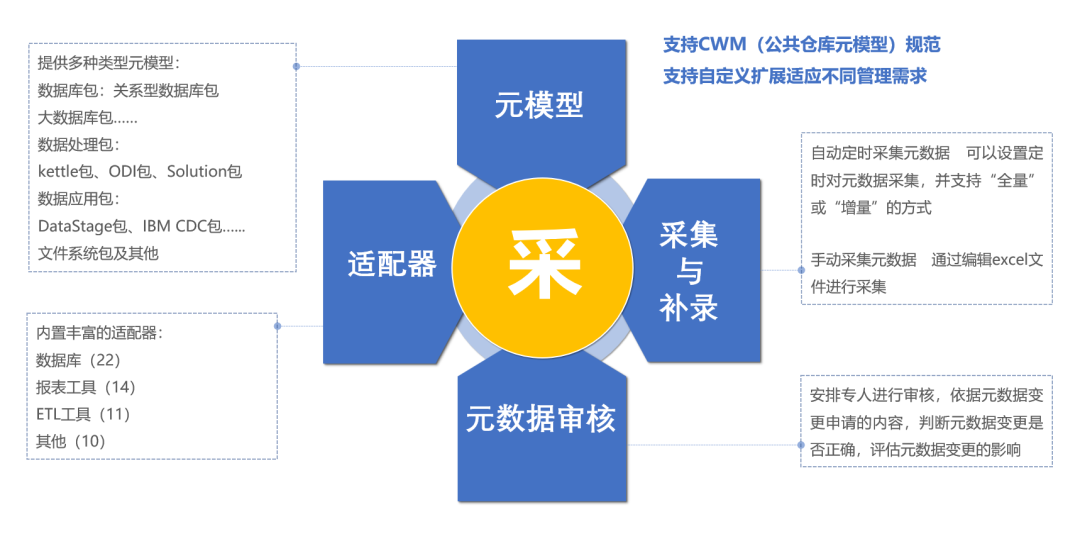 数据采集性能,支持CWM(公共仓库元模型)规范,支持自定义扩展,满足大部分业务场景对性能的需求。