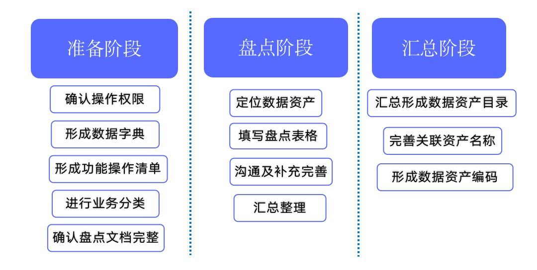 数据资产盘点工作,整体包括准备阶段、盘点阶段、汇总阶段三部分流程,其中盘点阶段根据所盘点系统的不同类型和特征,包含4个子流程、分别针对套装软件、自开发系统、分析系统、数据仓库召开盘点工作。