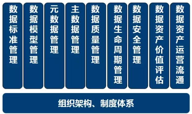 现在,数据资产管理已经形成了一套科学的管理架构体系,其体系架构如下图所示,主要包含9个活动职能和2个保障措施,9个活动职能指的是数据标准管理、数据模型管理、元数据管理、主数据管理、数据质量管理、数据生命周期管理、数据安全管理、数据资产价值评估和数据资产运营流通,2个保障措施包括组织架构和制度体系。
