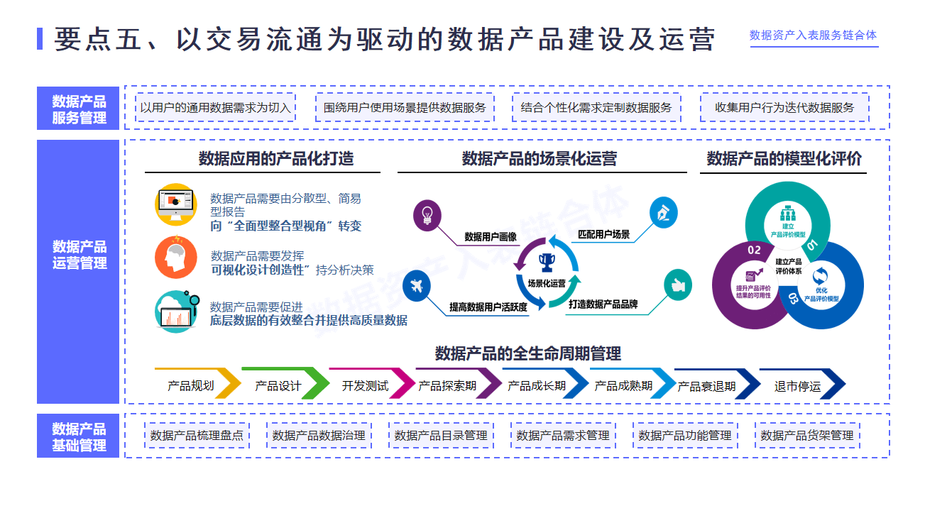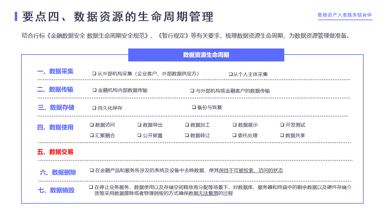 现代数据资源的全生命周期包括采集、传输、存储、使用、交易、删除、销毁等,实际会更复杂,比如数据使用里有数据的访问、导出、加工、展示等场景,这些工作就要围绕内部确权的结果来召开。