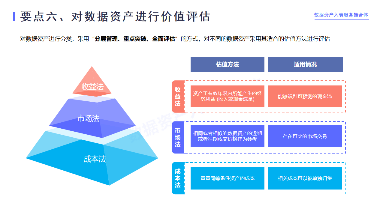 这一次财政部的规定对于数据质产的初始计量只允许以成本计量,但是数据资产定价和估值跟数据资源的入表可以是独立的。举例子:数据资产入表可以指入100块钱,但是估值说它值1万块钱,并且可以进行披露 。第二也允许做定价。企业的数据资产放到交易所,交易所现在都有很多的价格引擎会帮你定价,甚至可以自己定价。