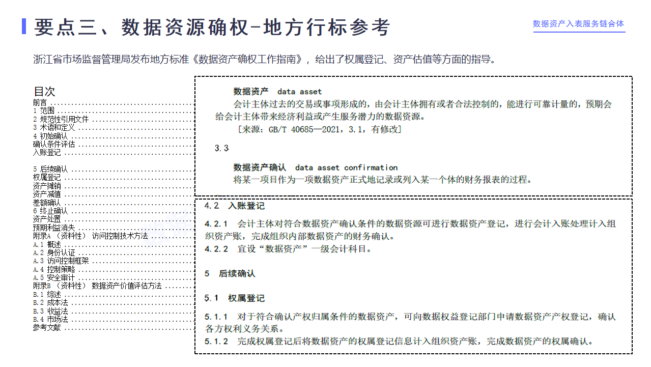 当然可能在各地不一样,图上是浙江的数据确权的一个地方指南,每个地方的有关数据资产确权登记的条例都不太一样,但总体是可以借助交易所帮企业实现数据资产的确权和认定,一旦拿到了数据相关部门颁发的数据产权登记证,就是实现了确权的背书。