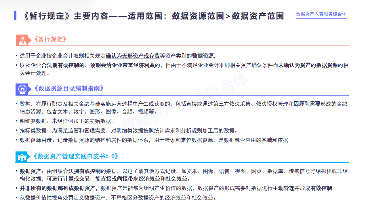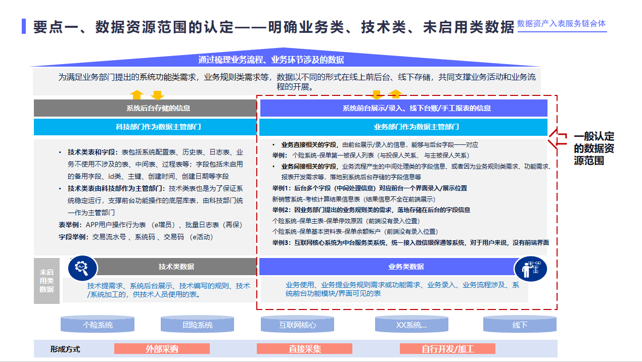 在实操过程中碰到的第一个最大的难题是范围的认定上,因为范围太广。比如说人行有发布一个《数据资源目录编制指南》,它对数据资源的定义非常之广泛——“所有业务经营管理过程中产生的电子类的数据,都称之为数据资源。”