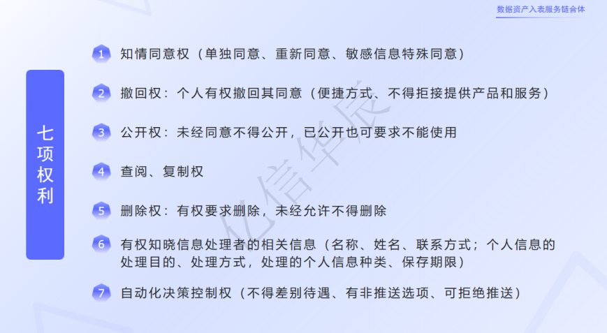 《个人信息保护法》是数据合规的根本。这部法的发条和要义较多,主要梳理了7大核心权利:知情同意权、撤回权、公开权、查阅复制权、删除权、有权知晓信息处理者的相关信息、自动化决策控制权。知情同意权是如果企业有了相关的数据,但在未经个人同意的情况下,是不太能动这些数据的。还有一个很重要的是撤回权,比如我作为用户把一部分信息给到了APP、公司或平台,但我可以随时撤回,如果我要求撤回授权,那平台就不能再拿着这个数据进行相应开发。