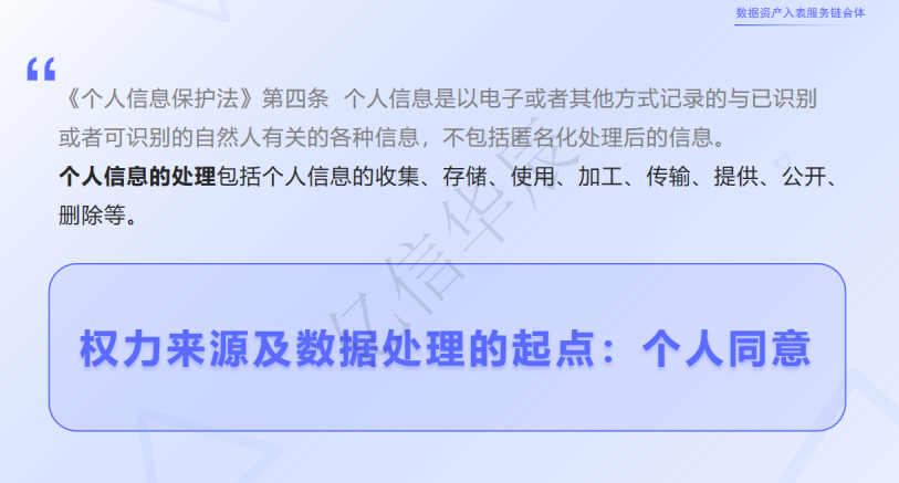 《个人信息保护法》非常重要,是具体指导数据合规和企业日常使用数据的法律。这个立法是因为现在数据市场还未完全建立起来,无法自上而下的立法,所以就选择了一个最简单最实用的方法,就是自下。先去设立一些红线和底线,把红线设立完后,对于红线之外能干的现在是空白状态,在这样的法律框架下,现在还是处在一个比较灵活的空间。《个人信息保护法》70多条,其核心内容就是为什么要做数据合规,就是把手上这些拿过来的数据做合法性的确认,确认是合法来源,是属于企业拥有的数据资产。个人同意是数据合规里很重要的一部分,因为需要保护的数据大部分是个人数据,现在企业大部分走的是不正当竞争的立法范畴。