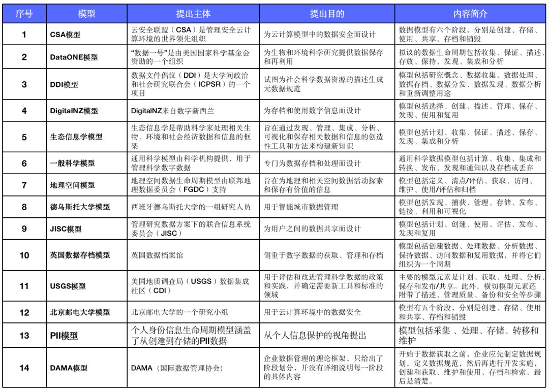 许多模型都是为解决数据管理中的一个特定问题或特定目的而设计的,顺利获得对比分析可以发现有些阶段是每个模型共同的,比如数据创建/接收,有些阶段则是独有的,比如