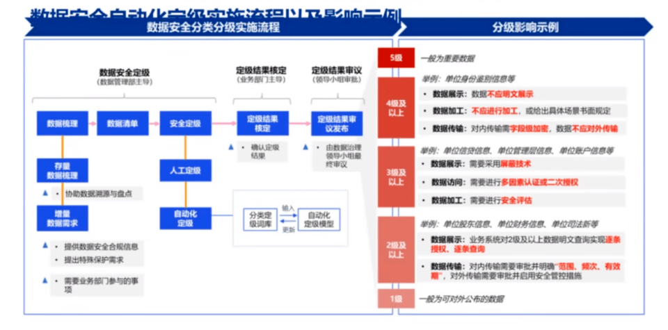 第二,考虑安全分类分级的时候要考虑每一个等级的数据,当发现安全等级的颗粒度划分不足以支撑后续做更精细化的管理时,分类分析体系就要去做相应的细化和调试,从而建立一个相对稳定的分类分级流程以及分类分级的标准体系。