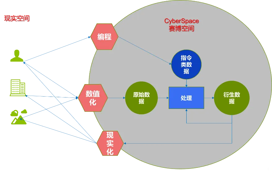 现实空间和赛博空间有三个非常重要的作用点,即:编程、数值化、现实化。