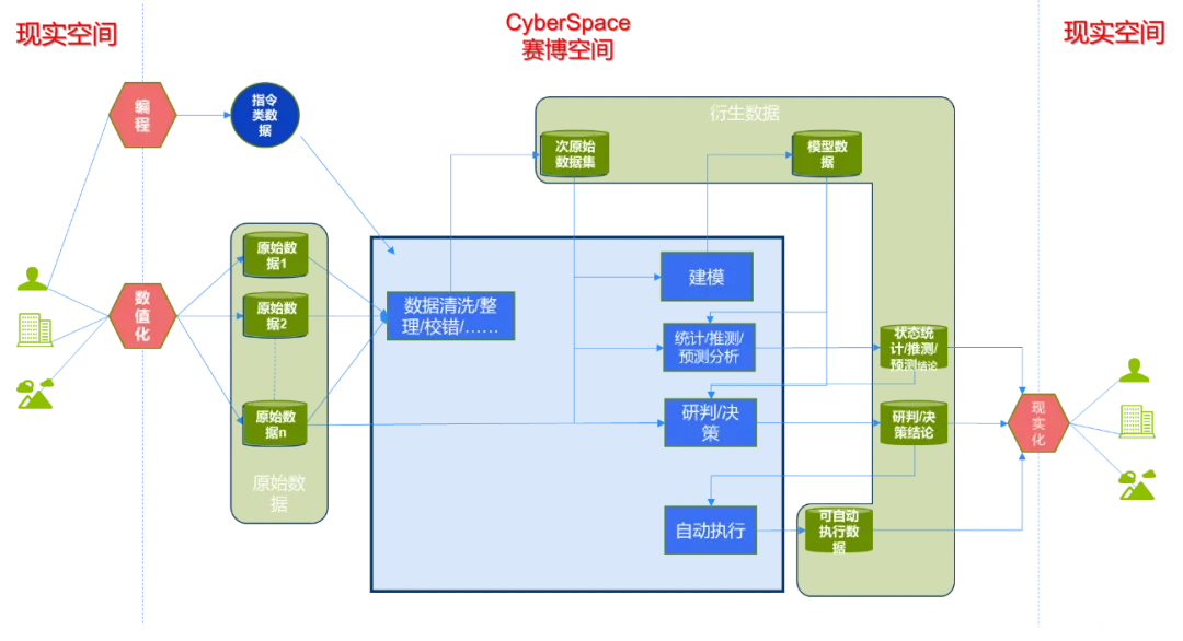 现实化环节是赛博空间数据作用于现实世界的关键环节。数据主要顺利获得两种途径影响现实世界,一是顺利获得影响人的行为,人们根据主动或被动接收到的、由数据转化而来的、可理解的信息或指令,做出行为或直接执行决策;二是可自动执行数据被输入到各类自动执行装置中,触发形成各种可以影响现实世界的物理、化学过程。