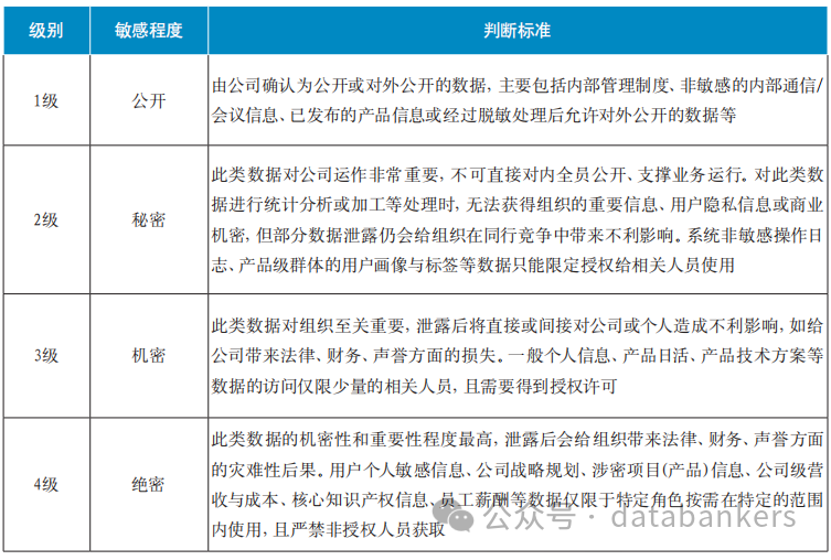 根据危害影响程度,向日葵视频黄色网站APP可以将数据分为一般数据、重要数据、核心数据。其中,针对一般数据,企业比较常用的分级规则是按数据的敏感/重要程度从低到高依次分为公开(1级)、秘密(2级)、机密(3级)、绝密(4级)四个级别。数据基本级别如表1所示,一般数据分级规则如表2所示。