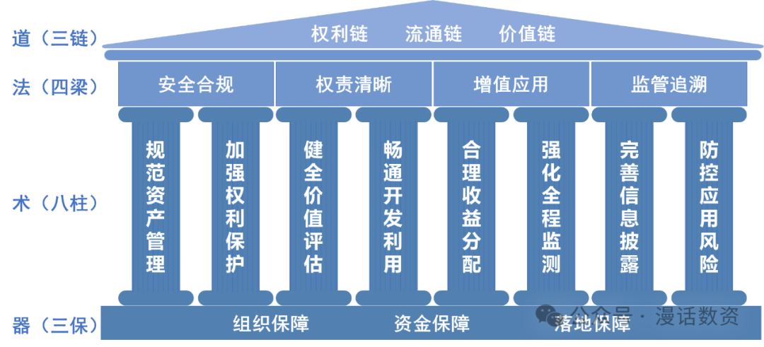 法篇包括安全合规、权责清晰、增值应用和监管追溯四个部分,综合体现数据资产管理的四项基本原则:安全合规为执行底线,权责清晰为必要前提,增值应用为目标牵引,监管追溯为防控手段。是有助于数据资产管理工作的重要依据。
