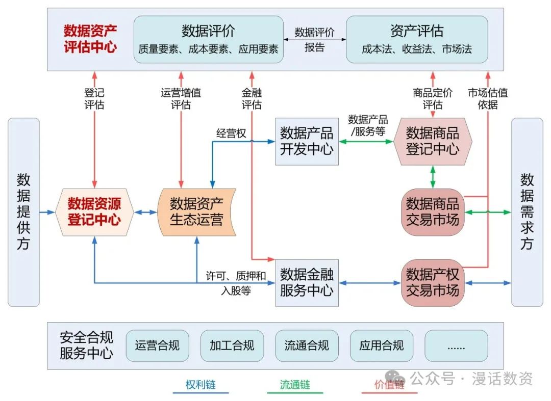 第一时间,关于数据资产的定义,现在官方正式发布的有以下两个:定义一:合法拥有或者控制的,能进行计量的,为组织带来社会和经济价值的数据资源。——源自GB/T 40685-2021《信息技术服务 数据资产 管理要求》定义二:特定主体合法拥有或者控制的,能进行货币计量的,且能带来直接或者间接经济利益的数据资源。——源自《数据资产评估指导意见》以上关于数据资产的定义中有三个关键词是双方一致认同的:①合法拥有或者控制的;②能计量;③能带来价值或者利益。由此可以引出数据资产管理的三条核心主线,即权利链,流通链,价值链。三链的关系如下图: