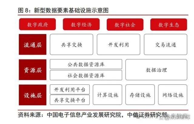 二、网络基础设施为数据要素流通的重要基石。数据要素的流通主要基于各类网络, 包括数据中心网络、企业园区网络、工业互联网等,对应的基础设施包括交换机、路由器、 服务器、安全设备等。中国“十四五”规划纲要从现代化、数字化方面对加快新型基础设 施建设提出了方针指引,从长期战略规划角度对信息通信行业的数字化开展提出新要求。